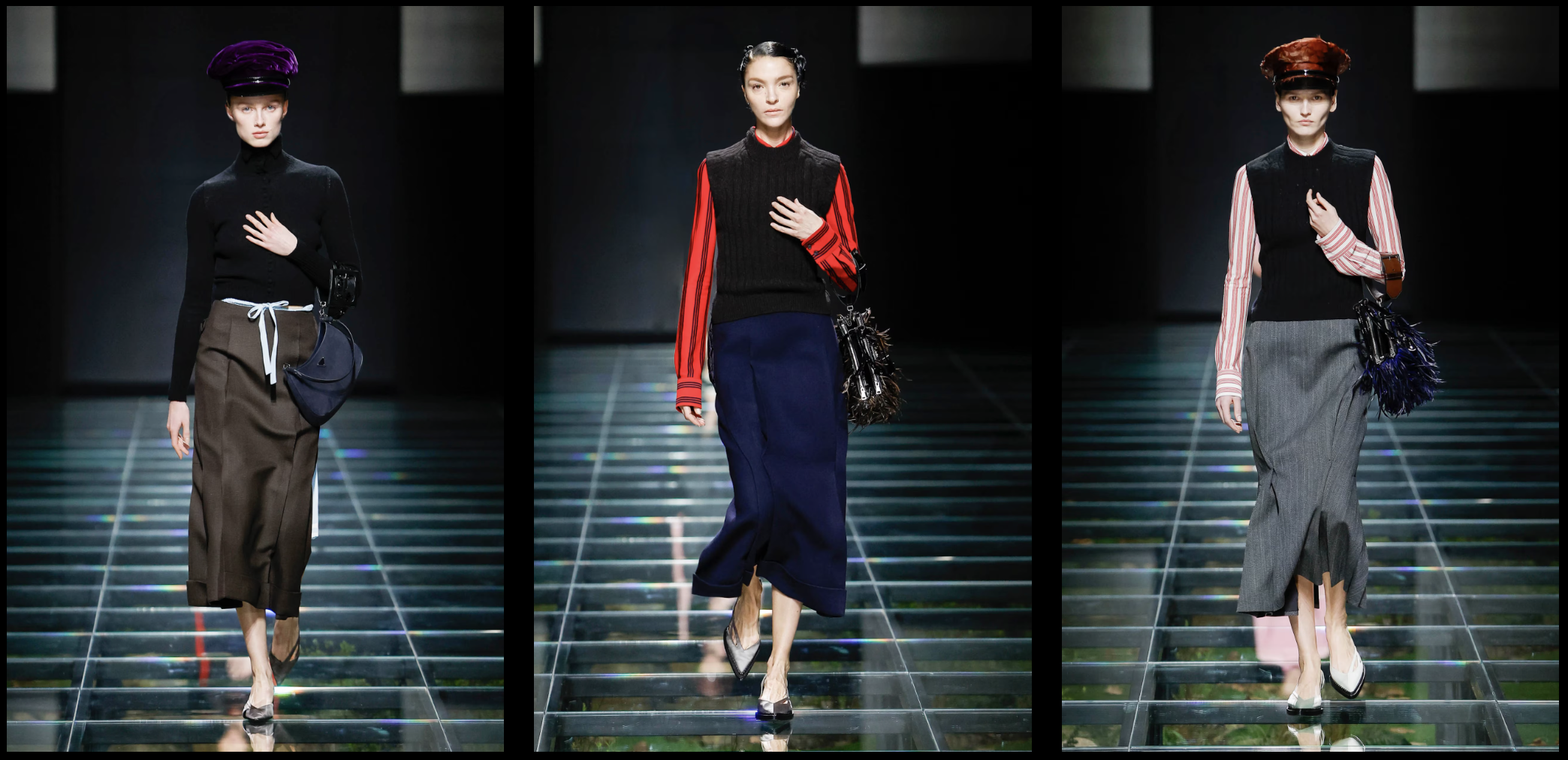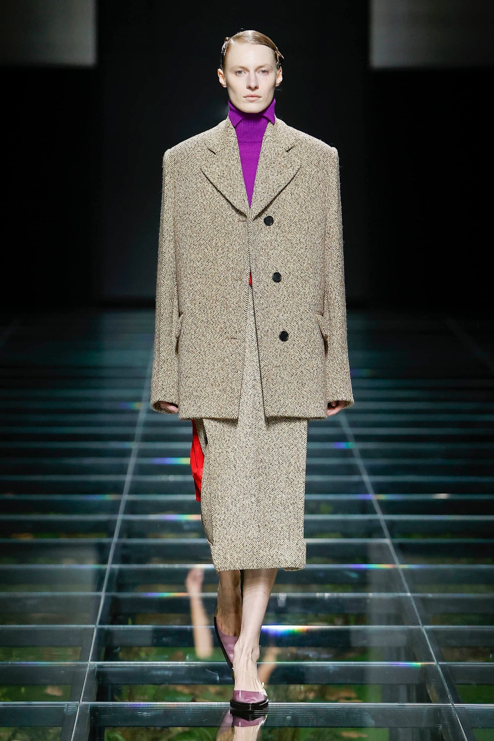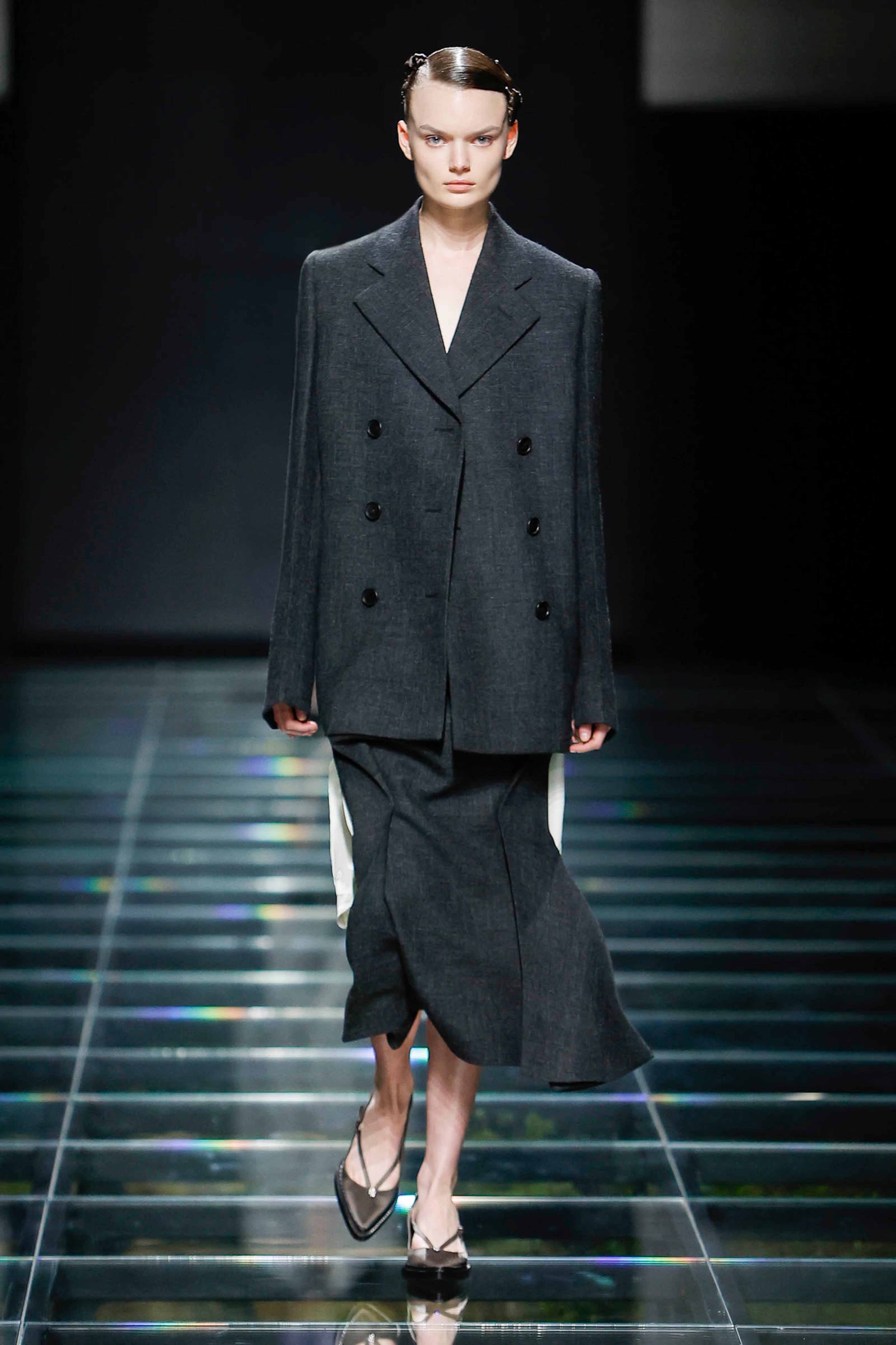 하지만 게중에는 이런 트렌드를 따라가고자 하는 브랜드도 있으니 결국 이렇게 프로스 앤 콘스, 포지티브 앤 네가티브, 현대와 과거, 지속과 반항 이 모든 것들이 섞이게 된다. 누가 맞다, 멋지다 그런 게 아니라 이렇게 섞여 총체적으로 엿보이는 덩어리가 시대의 룩이라 할 수 있다. 아무튼 예전 알레산드로 미켈레의 구찌처럼 스케일이 큰 반발을 하는 곳도 있지만 아주 조심스럽게, 눈에 잘 띄지 않게 어딘가 건드려 보려는 곳도 있다. 프라다 2024 FW에서 눈에 띄는 게 몇 가지 있긴 한데 그중 하나가 긴 소매 길이.
