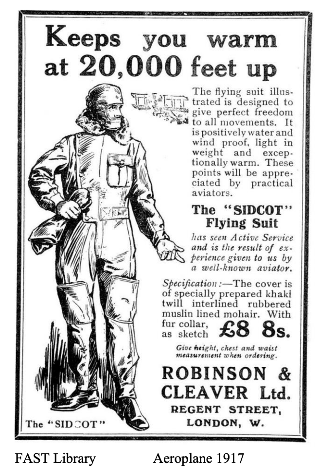 1918년 RAF의 207 Squadron. 사진은 임페리얼 워 뮤지엄(링크). 1916년 호주군 소속 Frederick Sidney Cotton가 항공기 작업을 하다가 옷을 갈아입을 시간조차 없어서 전신 작업복을 입은 상태로 비행에 나섰고 이 옷이 비행에 괜찮다는 사실을 깨닫게 된다. 1917년 말 영국의 항공 위원회는 시드콧 플라잉슈트가 작전에 가장 적합하다고 판단했고 Robinson & Cleaver에서 디자인을 완성하고 제작했다. 왼쪽 둘이 입은 게 전형적인 시드콧 플라잉 슈트. 오른쪽 분이 입고 있는 건 최근에도 볼 수 있는 전형적인 작업용 커버올의 모습이다. 하지만 안에 모피 같은 게 보인다.